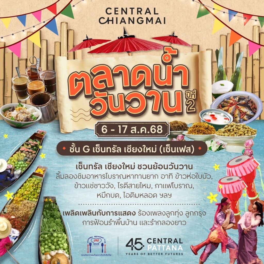 เซ็นทรัล  เชียงใหม่ ขอพาย้อนวันวานไปกับ “ตลาดน้ำวันวาน ปีที่ 2” พร้อมดื่มด่ำกับมนต์เสน่ห์ของท่าเรือย้อนยุคของภาคเหนือ ให้มาร่วมรำลึกความหลัง เพลิดเพลินไปกับสารพัดเมนูอาหารและขนมหวานในความทรงจำ ความสนุกและเสียงเพลงพาหวนวันวานไปพร้อมๆกัน