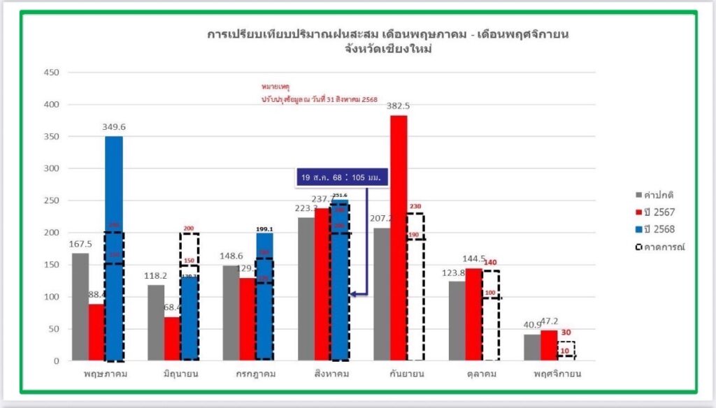 วันนี้ (2 ก.ย. 68) ดร.สุกฤษณ์ เกิดแสง ผู้อำนวยการศูนย์อุตุนิยมวิทยาภาคเหนือ ได้เปิดเผยข้อมูลภายในการแถลงข่าวสื่อมวลชนจังหวัดเชียงใหม่ ครั้งที่ 23 ของสำนักงานประชาสัมพันธ์จังหวัดเชียงใหม่ ซึ่งจัดขึ้นที่มหาวิทยาลัยพายัพ เกี่ยวกับสภาพอากาศและการคาดหมายลักษณะอากาศในช่วงเดือนกันยายน 2568 นี้ โดยระบุว่า ในปี 2568 จังหวัดเชียงใหม่มีฝนตกเยอะตั้งแต่เริ่มต้นเข้าสู่ฤดูฝน มีปริมาณน้ำฝนสูงกว่าค่าปกติถึง 34.4 เปอร์เซ็นต์ เฉพาะในเดือนสิงหาคมที่ผ่านมามีปริมาณฝนมากกว่าเดือนสิงหาคมปีที่แล้วถึง 12 เปอร์เซ็นต์ และในภาพรวมตลอดทั้งเดือนมีฝนตกถึง 22 วัน