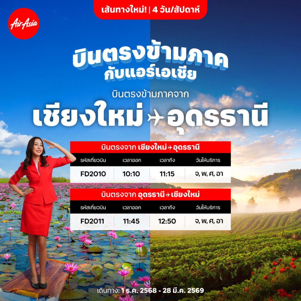 แอร์เอเชียเปิดบินตรงข้ามภาค “เชียงใหม่-อุดรธานี” เริ่มต้น 999 บาทต่อเที่ยวบิน! เชื่อมเหนือ-อีสานบินสะดวกยิ่งขึ้น จองได้เลย..เริ่มบิน 1 ธ.ค. 2568 นี้