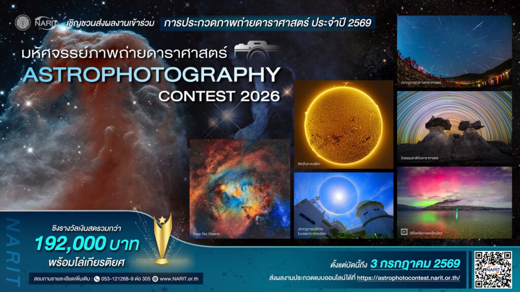 สถาบันวิจัยดาราศาสตร์แห่งชาติ (องค์การมหาชน) (สดร.) (NARIT) กระทรวงการอุดมศึกษา วิทยาศาสตร์ วิจัย และนวัตกรรม (อว.) ขอเชิญนักถ่ายภาพและประชาชนทั่วไป ส่งผลงานภาพถ่ายและวิดีโอเข้าร่วมการประกวด หัวข้อ “มหัศจรรย์ภาพถ่ายดาราศาสตร์” ประจำปี 2569 ชิงโล่เกียรติยศ พร้อมเงินรางวัลรวมมูลค่ากว่า 192,000 บาท เปิดรับสมัครและส่งผลงานตั้งแต่บัดนี้ ถึงวันที่ 3 กรกฎาคม 2569