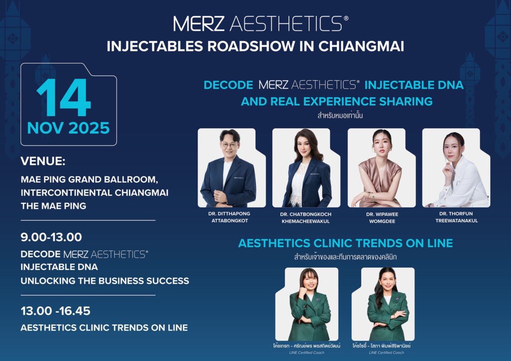งาน Merz Aesthetics Injectables Roadshow ครั้งนี้ถือเป็นโอกาสสำคัญสำหรับแพทย์และ ผู้ประกอบการคลินิกความงามในการอัปเดตองค์ความรู้เวชศาสตร์ความงามที่พัฒนาอย่างรวดเร็ว ทั้งในด้านเทรนด์ ความต้องการของผู้บริโภคยุคใหม่ จากผู้เชี่ยวชาญ ภายในงานยังมีการแบ่งปันมุมมองและกลยุทธ์การบริหารธุรกิจ ความงามแบบที่นำไปประยุกต์ใช้ได้จริง ช่วยให้คลินิกสามารถพัฒนาบริการให้สอดคล้อง และทันสมัยตอบโจทย์ ผู้เข้ารับบริการได้ดียิ่งขึ้น สร้างความแตกต่าง เพิ่มความเชื่อมั่น และต่อยอดการเติบโตธุรกิจอย่างยั่งยืน ท่ามกลางการแข่งขันในอุตสาหกรรมความงามที่เข้มข้นในปัจจุบัน