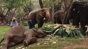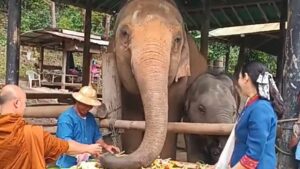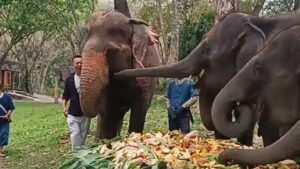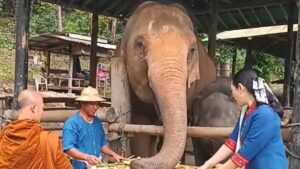 หลังเสร็จสิ้นพิธีสงฆ์และการจัดเลี้ยงในโซนหลัก พระอาจารย์ชาตรี พร้อมด้วยนางอัญชลีและคณะนักท่องเที่ยว ได้เดินทางต่อไปยัง “โซนบ้านพักช้างสูงวัย” เพื่อนำอาหารไปมอบให้แก่ช้างชราที่อยู่ในความดูแลของทางปาง โดยพระอาจารย์ได้เมตตาป้อนอาหารช้างอย่างใกล้ชิด ท่ามกลางบรรยากาศที่เต็มไปด้วยรอยยิ้มและความประทับใจของผู้ที่ได้ร่วมงาน