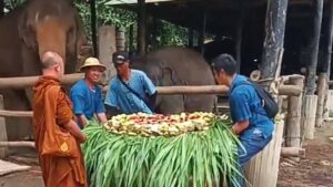 ไฮไลต์สำคัญของปีนี้ได้รับความเมตตาอย่างสูงจาก พระอาจารย์ชาตรี ซึ่งท่านได้เดินทางมาเป็นประธานฝ่ายสงฆ์ในพิธีเจริญพระพุทธมนต์เพื่อความเป็นสิริมงคล พร้อมกันนี้ พระอาจารย์ชาตรียังได้ให้ความเมตตาสนับสนุนงบประมาณทั้งหมดในการจัดซื้อผลไม้และอาหารช้าง เพื่อนำมาจัดเป็น “สะโตกช้าง” หรือบุฟเฟต์ผลไม้ถาดขนาดยักษ์ ให้ช้างในโซนจัดแสดงได้อิ่มหนำสำราญตลอดทั้งวัน