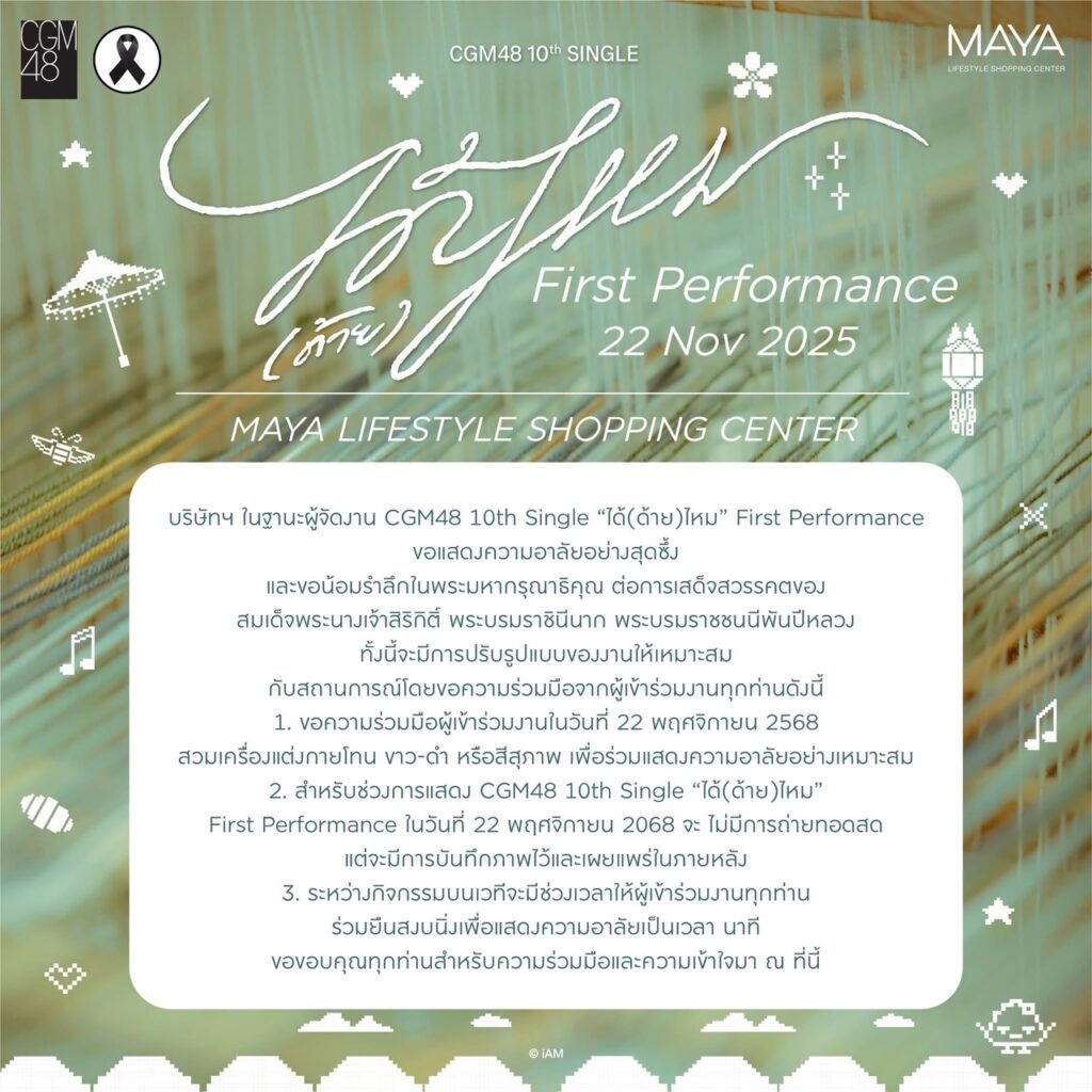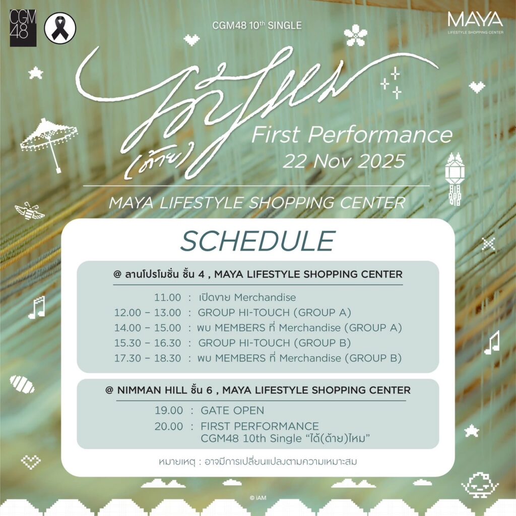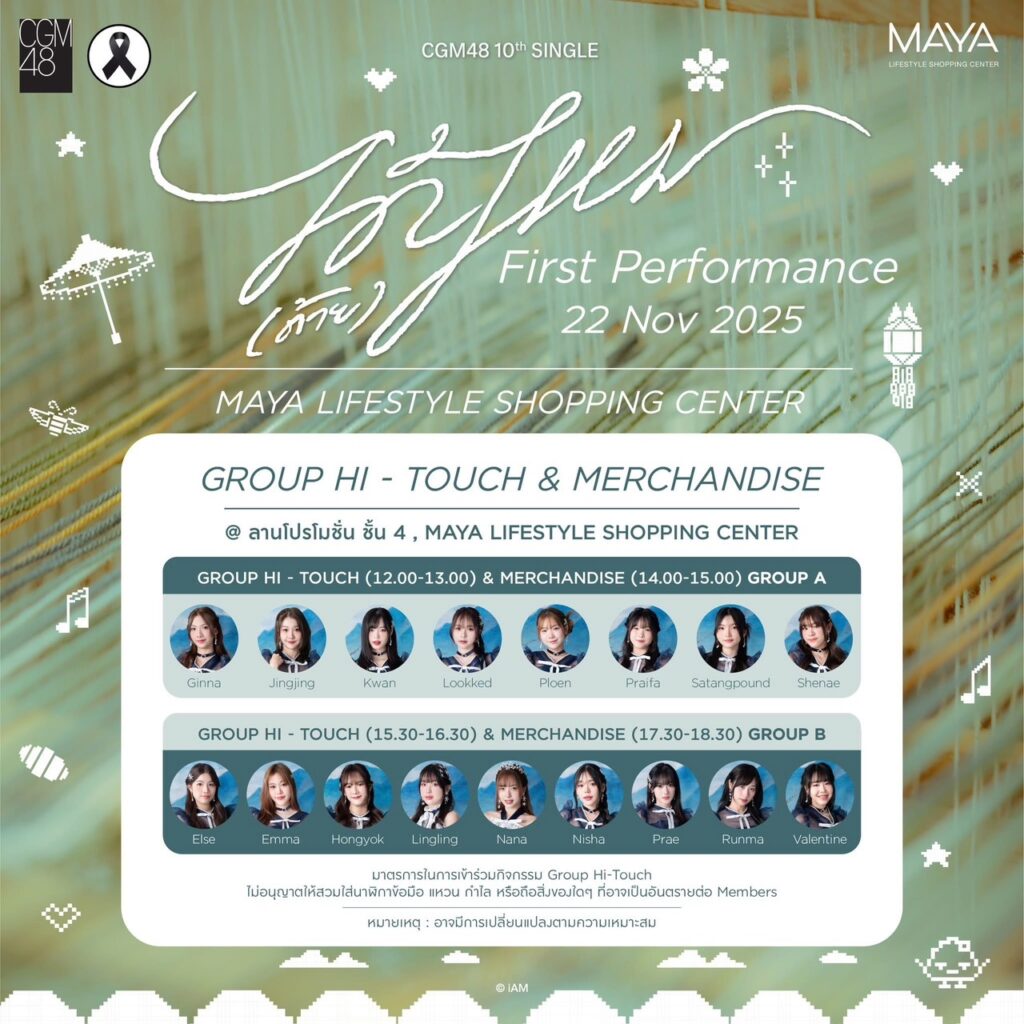 CGM48 จัดเต็มทั้งเสียงเพลง ความใกล้ชิด และความน่ารักที่ละลายใจแฟนคลับทั่วเชียงใหม่อย่างแท้จริง! เมื่อ CGM48 ยกทัพสมาชิกทั้ง 17 คน ขึ้นเวทีในงาน “CGM48 1st Performance 10th Single & Group Hi-Touch” ภายในงานแฟน ๆ ได้ใกล้ชิดกับไอดอลขวัญใจผ่านกิจกรรม Group Hi-Touch สุดอบอุ่น พร้อมชมการแสดงเปิดตัว ซิงเกิลที่ 10 ที่ผสมผสานดนตรีร่วมสมัยกับกลิ่นอายความเป็นล้านนา ถ่ายทอดโดยสมาชิกทั้งวงด้วยพลังเต็มร้อย