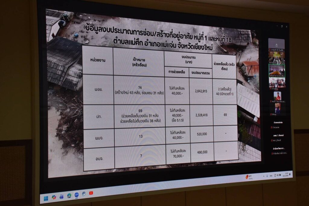 ที่ประชุมได้รายงานถึงความคืบหน้าผลดำเนินงานจากทุกหน่วยงานต่างๆที่เกี่ยวข้อง และความคืบหน้าการซ่อมและสร้างที่อยู่อาศัยพื้นที่หมู่ที่ 1 และหมู่ที่ 18 ซึ่งสถาบันพัฒนาองค์กรชุมชน (พอช.) มีการดำเนินการสร้างอาศัยให้ใหม่ทั้งหลัง จำนวน 43 หลัง และซ่อมแซม จำนวน 31 หลัง ขณะนี้การซ่อมแซมเสร็จสมบูรณ์แล้ว จำนวน 2 หลัง ส่วนที่เหลือกำลังเร่งดำเนินการ โดยมีงบประมาณรวม 2,642,915 บาท ช่วยเหลือไม่เกินหลังละ 40,000 บาท ด้านกรมป้องกันและบรรเทาสาธารณภัย (ปภ.) มีงบประมาณรวม 2,328,418 บาท ช่วยเหลือไม่เกินหลังละ 49,500 บาท จำนวน 69 หลัง ด้านสำนักงานพัฒนาสังคมและความมั่นคงของมนุษย์จังหวัด (พมจ.) มีงบประมาณรวม 520,000 บาท ช่วยเหลือไม่เกินหลังละ 40,000 บาท ช่วยเหลือผู้สูงอายุและผู้ทุพพลภาพ จำนวน 13 หลัง และด้านองค์การบริหารส่วนจังหวัด (อบจ.) มีงบประมาณรวม 490,000 บาท ช่วยเหลือไม่เกินหลังละ 70,000 บาท จำนวน 7 หลัง