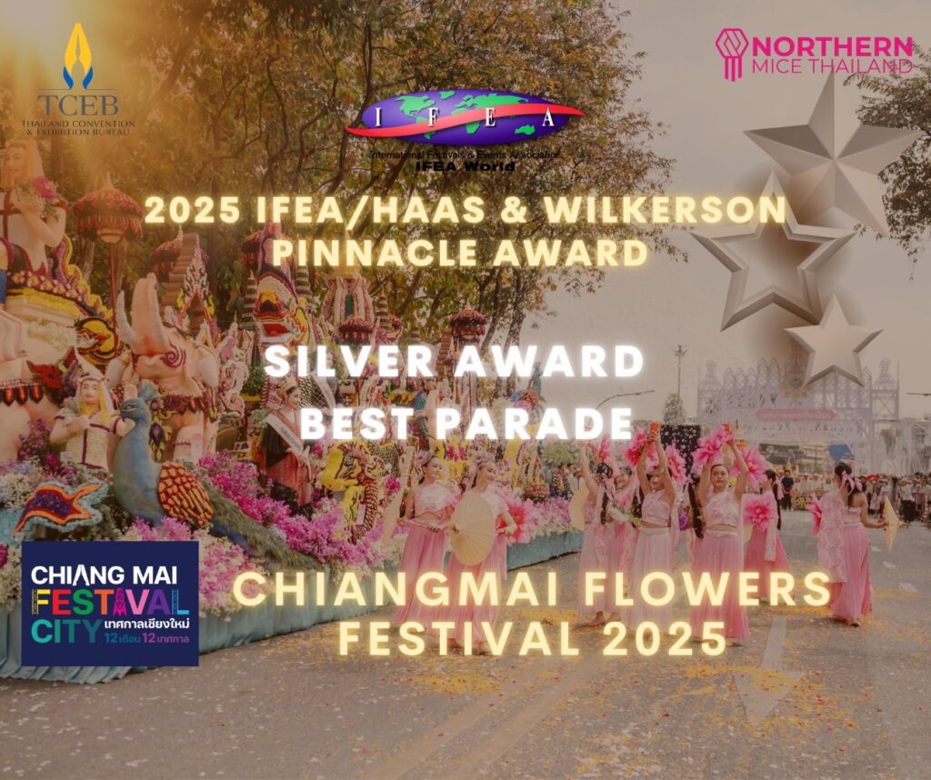 เชียงใหม่, 23 กันยายน 2568 – จังหวัดเชียงใหม่สร้างชื่อเสียงอีกครั้งบนเวทีโลก เมื่อ “ขบวนรถบุปผชาติ” จากงานมหกรรมไม้ดอกไม้ประดับจังหวัดเชียงใหม่ ประจำปี 2568 ได้รับรางวัล Silver Award ประเภท Best Parade จากการประกวด 2025 IFEA/Haas & Wilkerson Pinnacle Award Competition ซึ่งจัดโดยสมาคมงานเทศกาลและอีเวนต์นานาชาติ (International Festivals & Events Association: IFEA) ภายในงาน IFEA’s 70th Anniversary Convention & Expo ณ เมืองปาล์มสปริง รัฐแคลิฟอร์เนีย สหรัฐอเมริกา โดยความสำเร็จอันน่าภาคภูมิใจนี้ สะท้อนถึงพลังแห่งความคิดสร้างสรรค์และศักยภาพของชาวเชียงใหม่ที่ร่วมกันรังสรรค์ผลงานขบวนรถบุปผชาติอันวิจิตรงดงามจนเป็นที่ยอมรับในระดับนานาชาติ