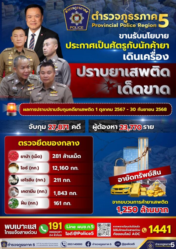 ทั้งนี้ในปีงบประมาณ 2568 ระหว่างวันที่ 1 ตุลาคม 2567 – 30 กันยายน 2568 ตำรวจภูธรภาค 5 มีผลการปราบปรามจับกุมคดียาเสพติดดังนี้